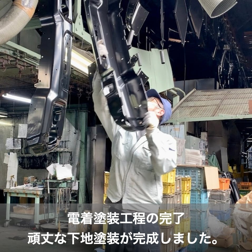 バンパー裏側のフレーム部分には、そのさらに裏側の見えない部分にまで防錆コーティングを施します。