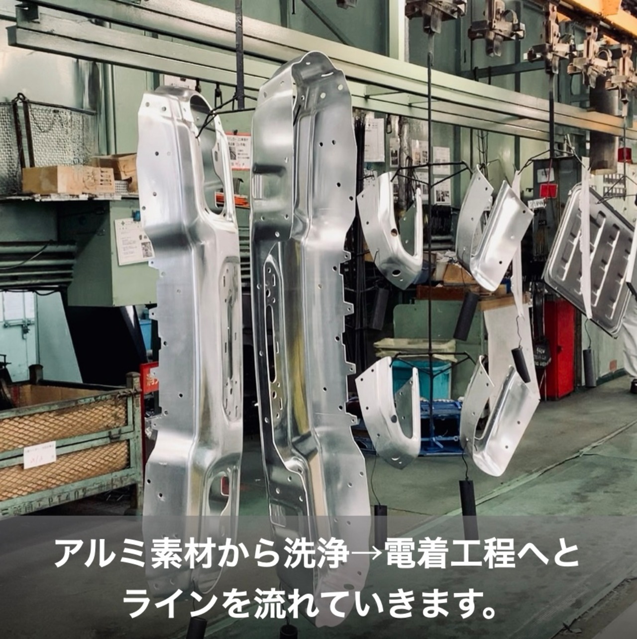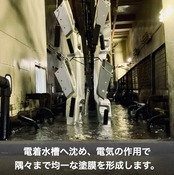カチオン電着塗装工場では新車部品生産と同じラインで、生産計画の隙間を縫って電着塗装を施します。
